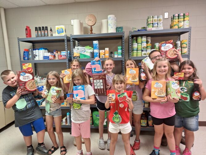 GLADBROOK – The Gladbrook Community Kids Club recently donated food to the Northwest Tama County Food Pantry (left photo). The club also prepared and blessed backpacks for Orphan Grain Train with help from Pastor Gideon Gallo (right photo).
