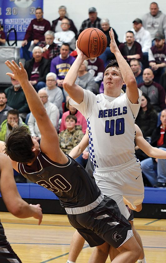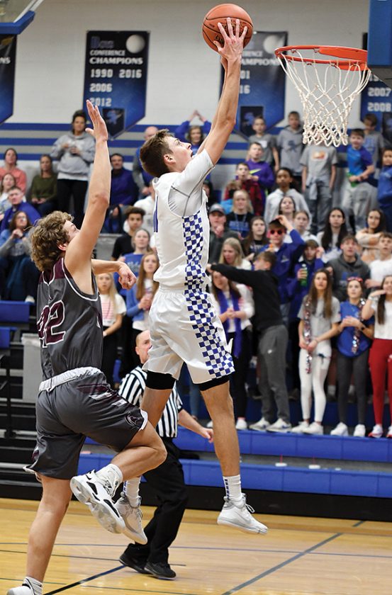Gladbrook-Reinbeck junior William Kiburis goes up for the dunk as Grundy Center’s Patrick Brown III gives chance during the second quarter of the Rebels’ 55-47 win Friday night in Reinbeck. Kiburis scored a game-high 23 points as the Class 1A No. 6 Rebels claimed their second-straight NICL West Division title. Photo by Noah Rohlfing
