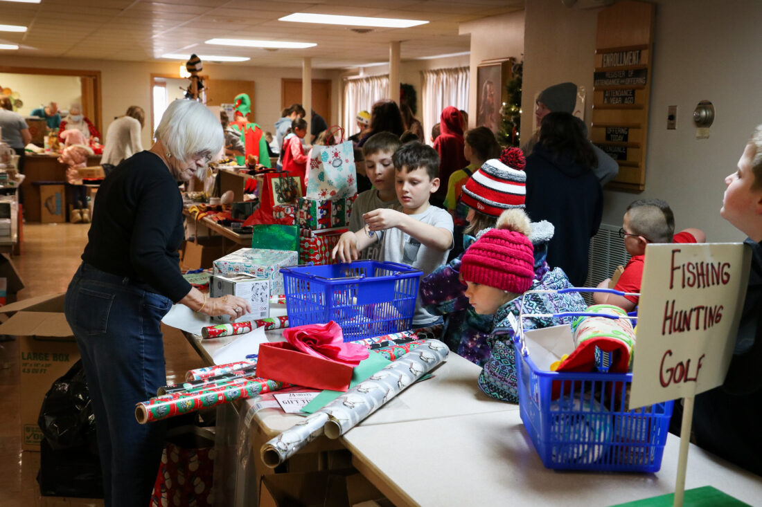 Claire Handorf (left) assists participating children during the annual Kids Shopping Day event held at Peace Church in Gladbrook last year. SUN COURIER FILE PHOTO