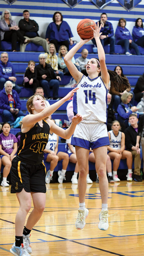 Gladbrook-Reinbeck freshman Kennedy Brant (14) rises up for a jumper over Janesville defender Hayden Pugh (4) during the second half of Thursday’s Class 1A Region 1 basketball game in Reinbeck. Brant scored 15 points to help the Rebels win 56-34. PHOTO BY NOAH ROHLFING