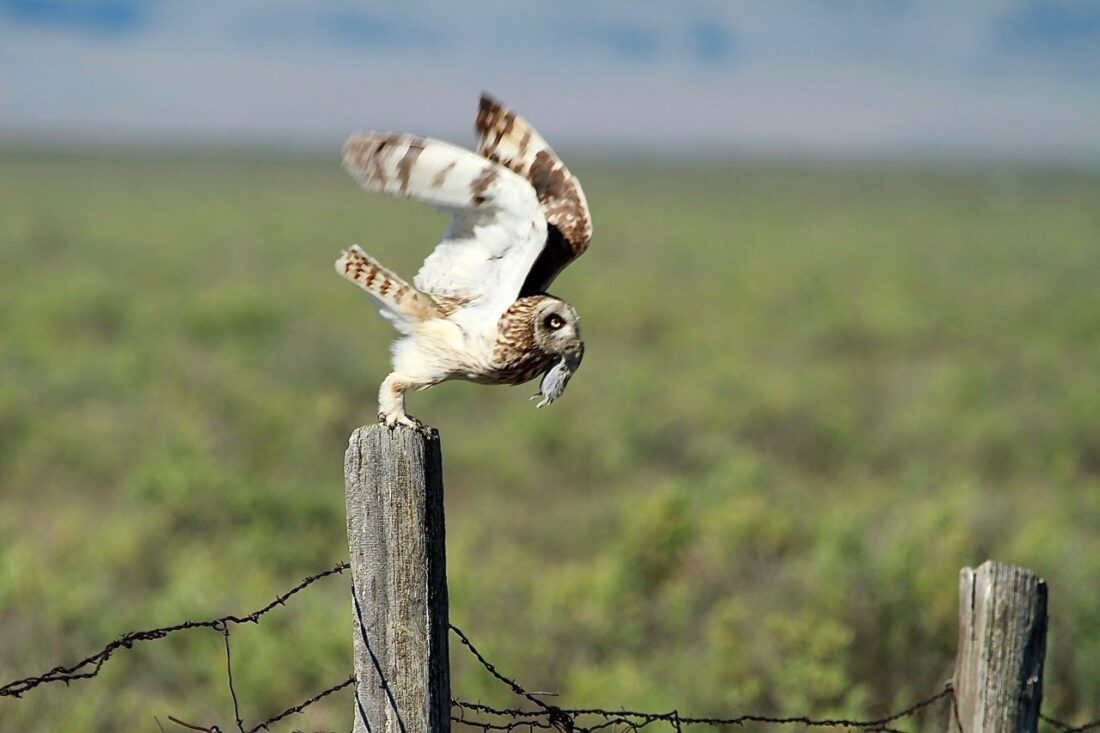 - A Short-eared owl takes off from a fence post with a rodent meal in its mouth. PHOTO COURTESY OF TOM SCHILKE/P.R.A.S.