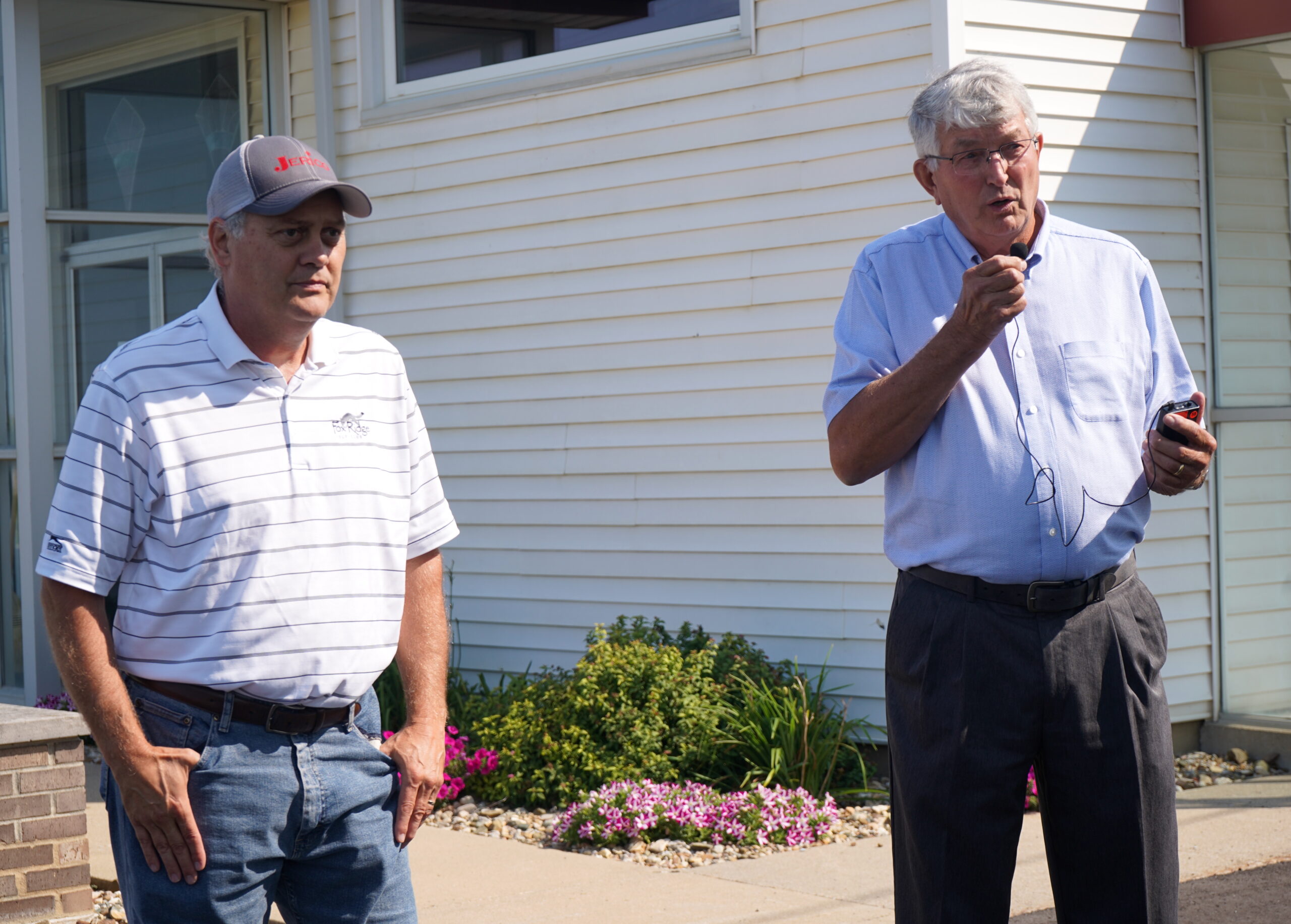 Grundy Co. Engineer Gary Mauer, left, pictured alongside Grundy Co. Supervisor Mark Schildroth during a ribbon-cutting ceremony held last Sept. 7 for the Grundy Road near Hudson. Mauer has been hired by Tama Co. as interim county engineer. PHOTO BY RUBY F. MCALLISTER