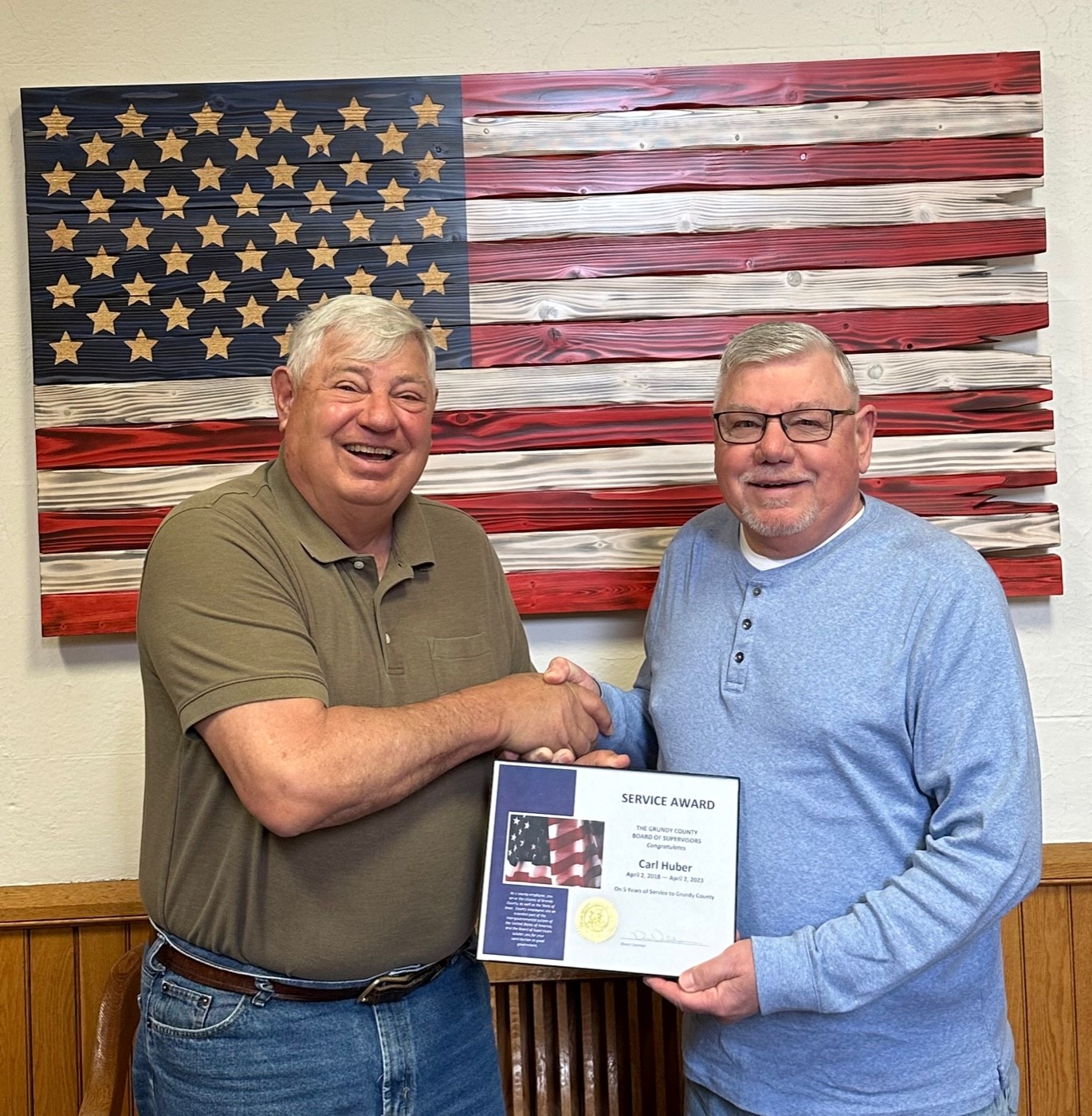 GRUNDY CENTER – Carl Huber, right, of the Grundy County Veterans Affairs Commission was recently honored for five years of service to the county. Board of Supervisors Chairperson Vic H. Vandehaar presented Huber with his service award. PHOTO COURTESY RHONDA R. DETERS, GRUNDY CO. AUDITOR