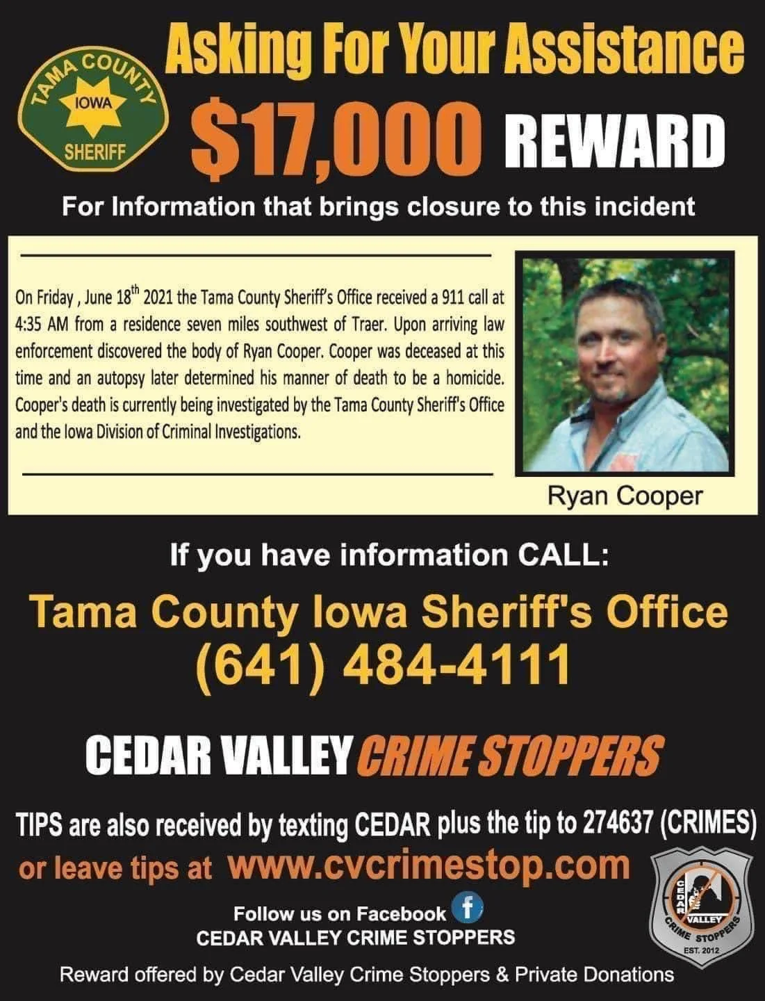 Those with information regarding Ryan Cooper’s death are asked to contact the Tama County Sheriff’s office at 641-484-3760, or text CEDAR plus the tip to 274637 (CRIMES).