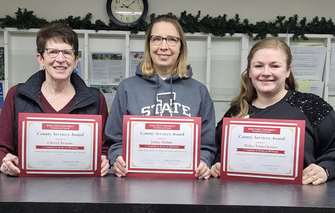 Tama County Extension and Outreach’s (l-r) Cheryl Bruene, Jenny Hulme, and Haley Princehouse pictured recently with their 2024 Creativity in Service to All Iowans Award. CONTRIBUTED PHOTO
