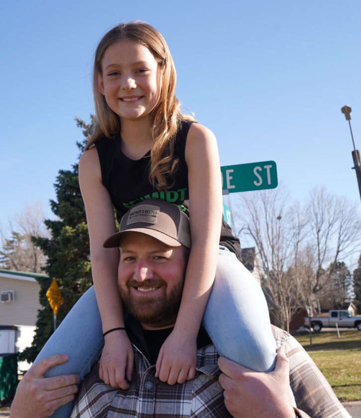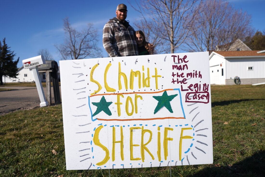 Republican candidate for Tama County Sheriff Casey Schmidt pictured alongside his daughter Maecy as they stand behind one of the yard signs she designed as part of his election campaign. ‘Schmidt for Sheriff: The Man, The Mith [sic], The Legind [sic],’ the sign declares. PHOTO BY RUBY F. MCALLISTER