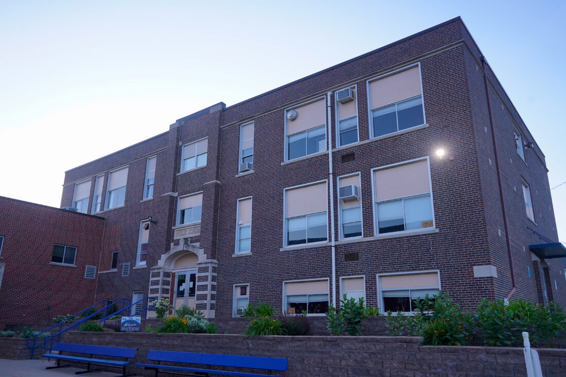 The GMG Community School District’s 1925 core secondary building in Garwin last Monday evening. The 99-year-old building would be replaced if a proposed Nov. 5, 2024 bond referendum is approved by a 60% supermajority of voters. The GMG school board approved contracting with design-build firm SitelogIQ during the Monday, June 10 meeting as part the planned referendum. PHOTO BY RUBY F. MCALLISTER