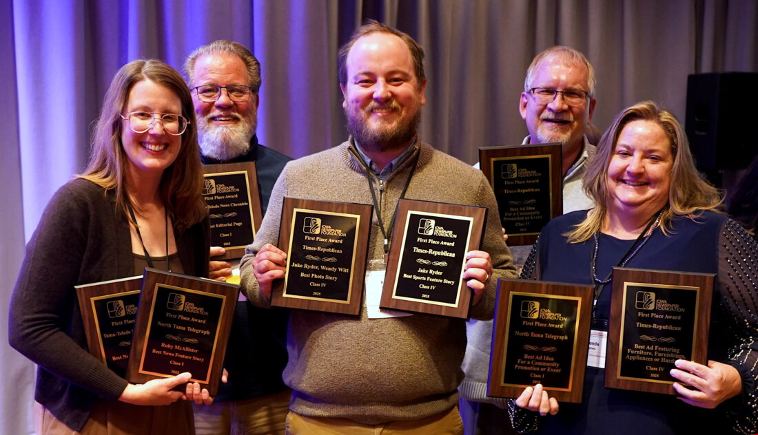 DES MOINES – The Times-Republican (T-R) and the Tama-Grundy newspapers took home a total of eight first-place awards across editorial, photography, website, and advertising categories during the annual Iowa Newspaper Association (INA) awards banquet held at the downtown Marriott in Des Moines last Thursday (Feb. 6) evening.