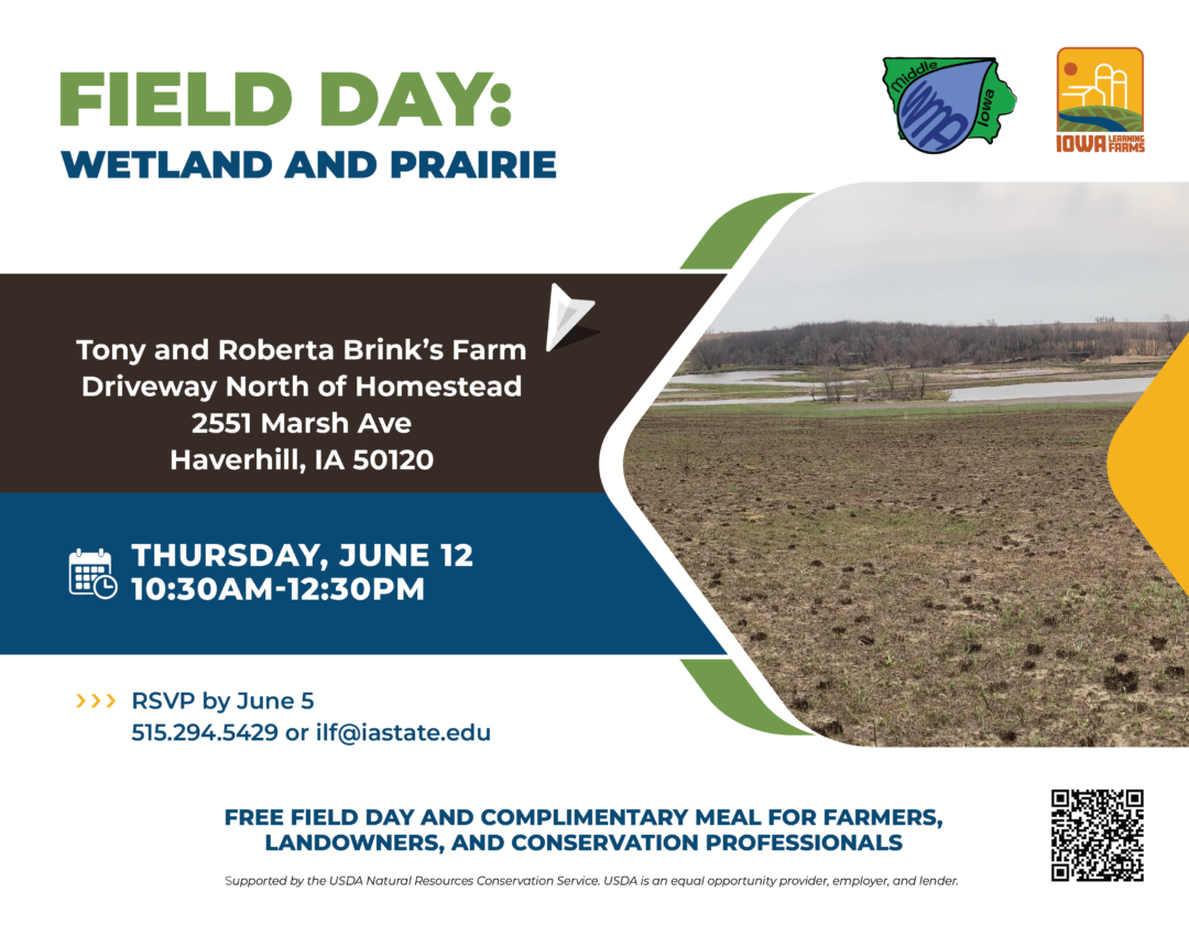 HAVERHILL – Iowa Learning Farms, in partnership with the Middle Iowa Watershed Management Authority and Marshall County Natural Resource Conservation Service, will host a wetland and prairie field day Thursday, June 12, from 10:30 a.m.-12:30 p.m. at Tony and Roberta Brink’s farm near Haverhill. The no-cost event is open to farmers and landowners and includes a complimentary meal.