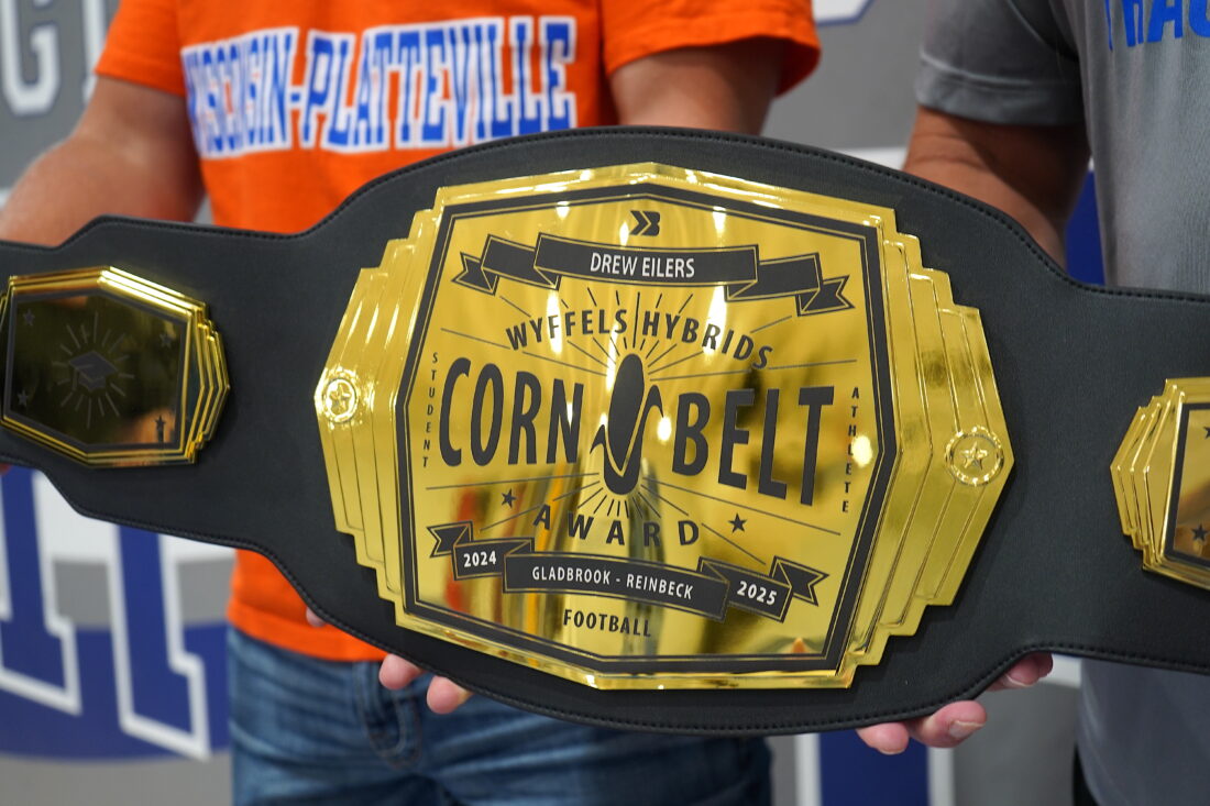 The 2024-25 Corn Belt Award signature championship belt belonging to Drew Eilers pictured on July 30. PHOTO BY RUBY F. MCALLISTER