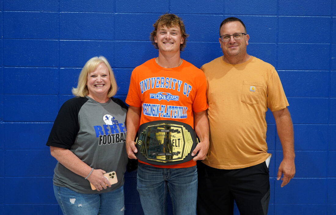 Drew Eilers, center, pictured with his family including his mom Jessica Eilers, left, and dad Jeremy Eilers, right, a Gladbrook-Reinbeck High School Class of 1991 alumnus. PHOTO BY RUBY F. MCALLISTER