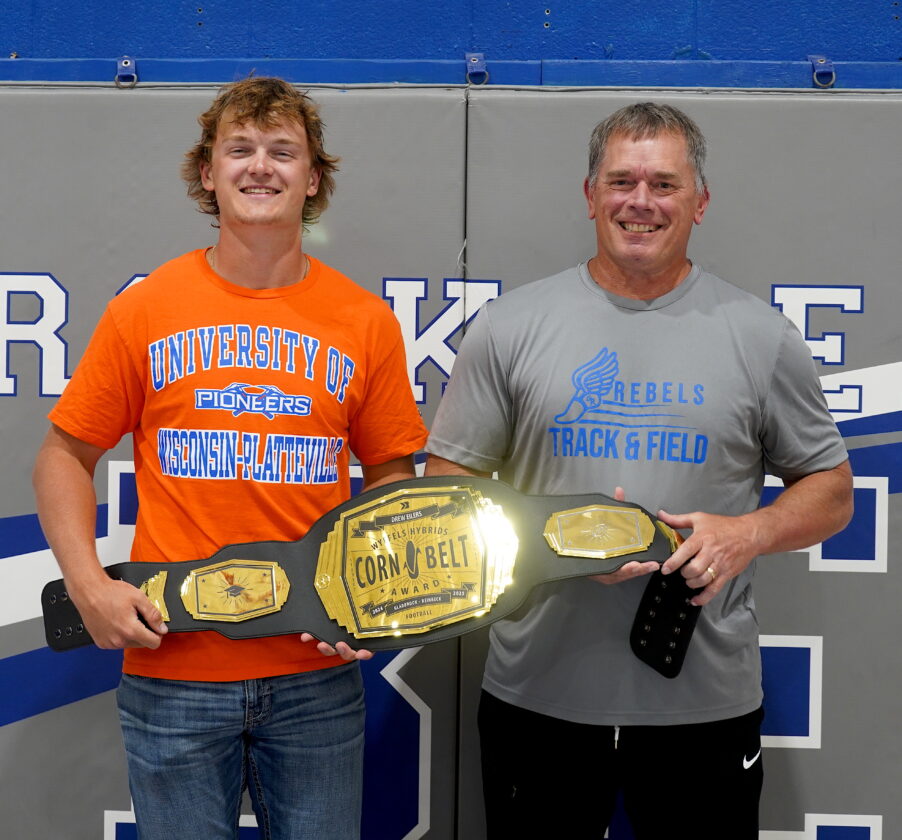 “It’s quite an honor,” G-R head track coach Kurt Luring said as reps from both Bound and Wyffels Hybrids, G-R activities director Brian Grooms, and Drew’s parents Jeremy and Jessica Eilers gathered under the basketball hoop for photos. As part of the award, which began during Iowa’s 2024-25 high school season and was bestowed on two (male and female) senior student-athletes per season, Drew received a signature championship belt and $1,000 scholarship.