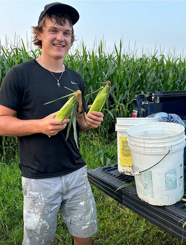 - Drew Eilers pictured this past summer while selling sweet corn he grew on a portion of his grandpa’s farm north of Reinbeck. As of press time, Drew was finished with sales for the season and was busy preparing to head to the University of Wisconsin–Platteville where he plans to major in ag business while playing defensive end for the Pioneers. PHOTO COURTESY OF JESSICA EILERS