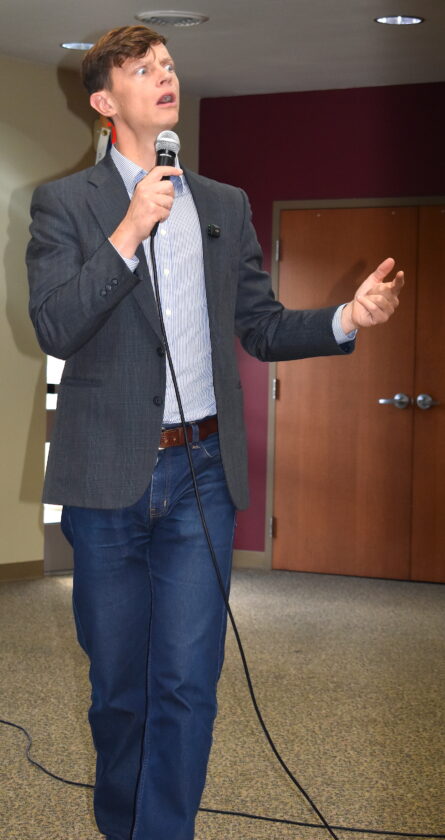 State Auditor and Democratic gubernatorial candidate Rob Sand addressed a crowd of about 60 people gathered at the Reinig Center in Toledo during an hourlong town hall meeting on Wednesday, Sept. 24. PHOTO BY ROBERT MAHARRY