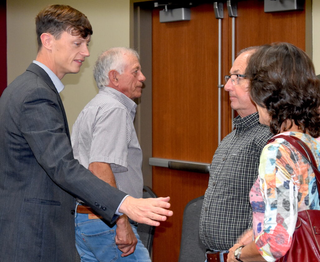 Sand, left, took time to shake hands and greet attendees before heading off to his next meeting in Poweshiek County on Wednesday, Sept. 24. PHOTO BY ROBERT MAHARRY