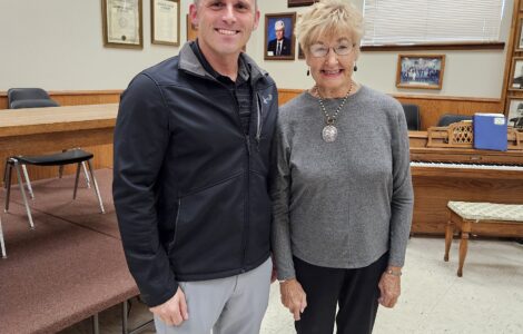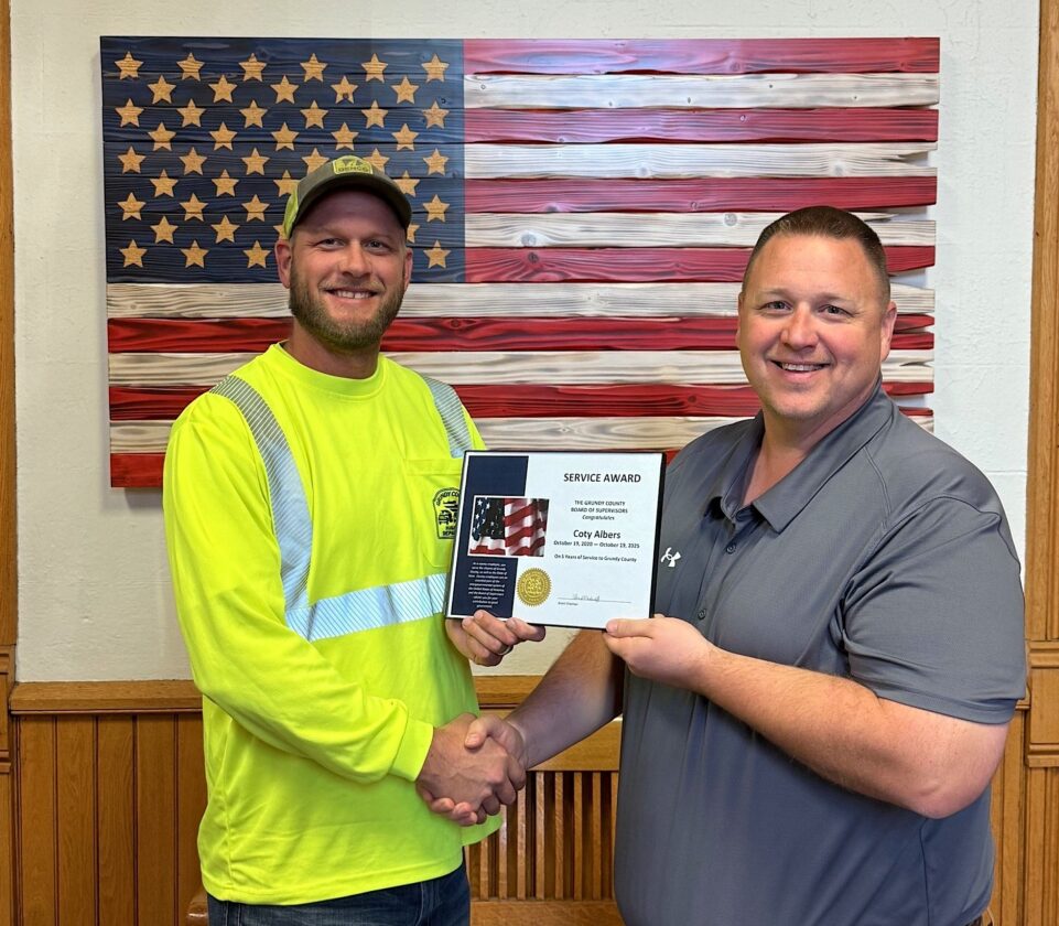 GRUNDY CENTER – Coty Albers, left, was recently honored for five years of service to Grundy County as a member of the Secondary Roads Department. County Engineer Jeff Skalberg, right, presented Albers with his service award.