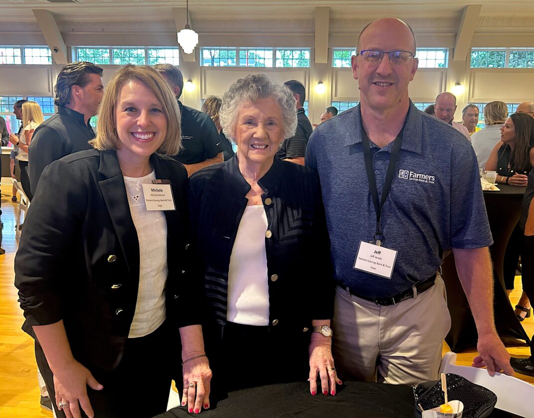 Farmers Savings Bank & Trust President and CEO Darlys Hulme, center, pictured alongside Vice President Michelle Werner, left, and Senior Vice President Jeff Jacobs, right, in Okoboji this past July during the 2025 Community Bankers of Iowa Annual Convention. CONTRIBUTED PHOTO