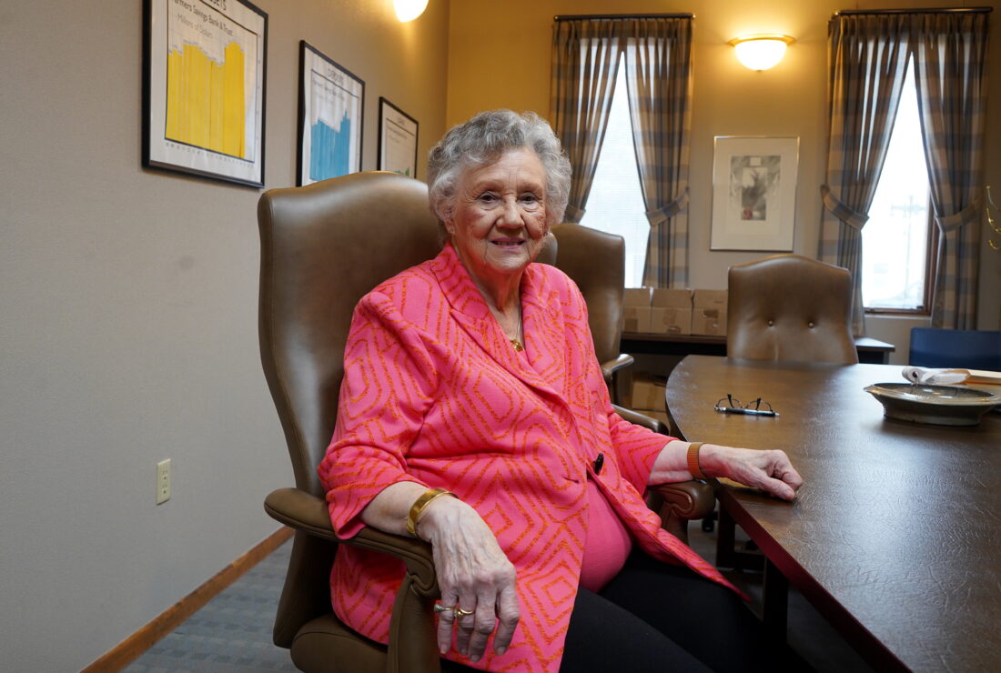 - Darlys Hulme, president and CEO of Farmers Savings Bank & Trust, pictured on Thursday, Oct. 16, in the boardroom at the bank’s Traer location. Hulme, a Traer High School Class of 1954 graduate, is celebrating 65 years in banking this year. She was recently honored with a lifetime achievement award. PHOTO BY RUBY F. MCALLISTER