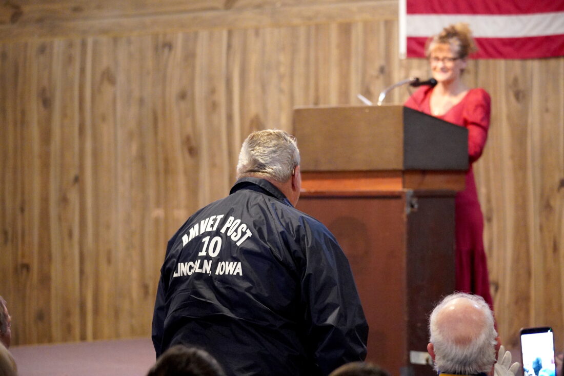 “For over 23 years, I have ran an office smaller than this auditorium that helps 1,400 veterans a year,” Ledvina told the audience as part of her address. Roughly halfway through her remarks, she recognized Tama County Veterans Affairs Commissioner Doug Sienknecht of Lincoln, seated in the front row, for inviting her to speak as part of the program.