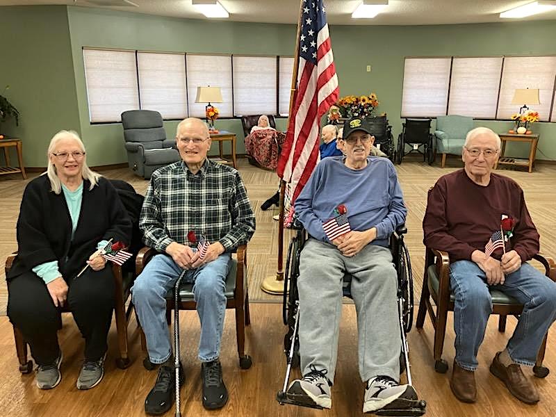 Veterans present during the Gladbrook American Legion Auxiliary’s Veterans Day program at Westbrook Acres on Nov. 11 included (from left) Shirley Neidermann, Roger Sievers, Steve Thomas, and Loran Frericks. PHOTO COURTESY OF JEANNE PAUSTIAN
