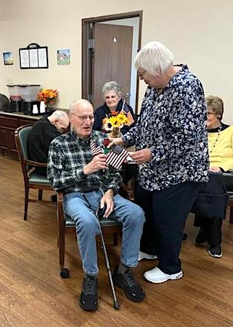 - Gladbrook ALA President Jeanne Paustian presenting veteran Roger Sievers with a flag and poppy. PHOTO COURTESY OF JEANNE PAUSTIAN