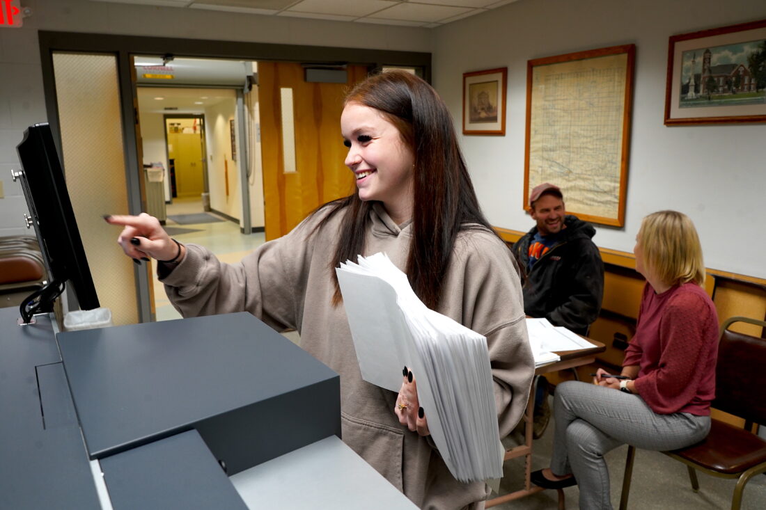 Tama County Elections Administrator Jenna Cremeans smiles while running ballots through the county's DS450 scanner and tabulator on Thursday, Nov. 20, in Toledo as part of the G-R bond referendum recount. The machine was purchased by Tama County in 2024 using American Rescue Plan Act funds. PHOTO BY RUBY F. MCALLISTER