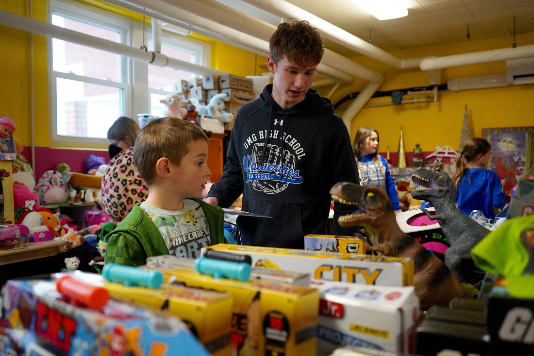 - Kids Shopping Day volunteer Drayson Stephenson (right), a senior at GMG High School, assists a young boy with his “shopping” on Saturday, Dec. 13, at Peace Church in Gladbrook. PHOTO BY RUBY F. MCALLISTER
