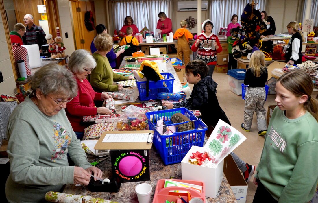 - An early scene from the 13th annual Kids Shopping Day held last Saturday at Peace Church in Gladbrook. The basement Christmas Store room, ringed with wrapping stations staffed by volunteers, was bustling with children shortly after the event’s 9 a.m. start. PHOTO BY RUBY F. MCALLISTER