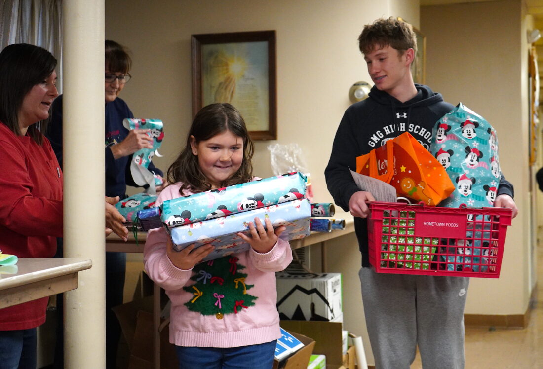 - Volunteer Drayson Stephenson (right), a senior at GMG High School, helps Sydney Thompson carry her wrapped gifts on Saturday, Dec. 13, during Kids Shopping Day at Peace Church in Gladbrook. PHOTO BY RUBY F. MCALLISTER