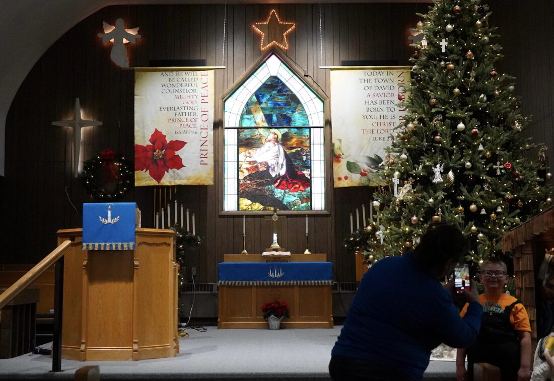 - A young boy has his picture taken last Saturday morning in front of the nativity scene set up inside Peace United Church of Christ’s sanctuary during Kids Shopping Day in Gladbrook. PHOTO BY RUBY F. MCALLISTER