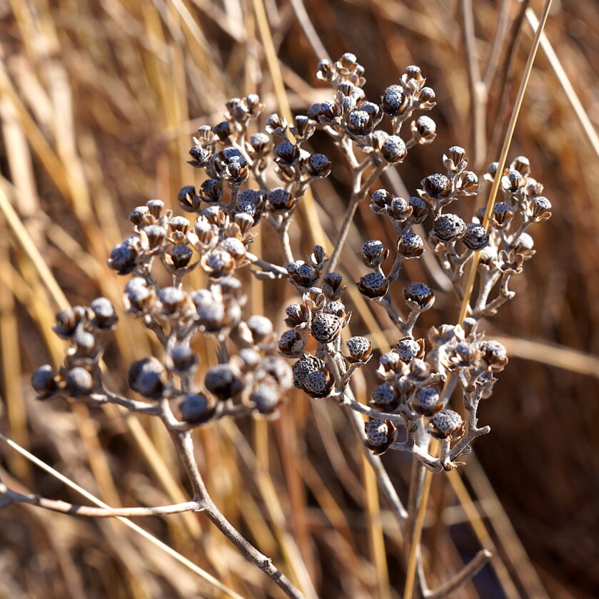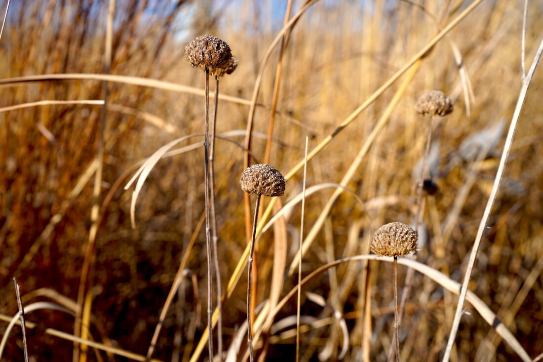 Only a few species of birds were spotted during the hike, including an impressive number of pheasants and a single “little brown job” no one was able to positively identify before it flitted into the grass. In terms of mammals, plenty of coyote scat was observed along the trails as well as several badger holes (yes, Irvine Prairie has a badger population). But there was still plenty to see as the sleeping prairie’s dormant plants boast an abundance of different textures this time of year in their dried seed heads and stalks. Of particular note, the delicate ‘stars’ of what remained of the Queen Anne’s lace, yarrow, and golden Alexander blooms; the prickly yet squooshy centers of the many expired coneflowers; and the remains of Canada wild rye which looked like scarecrow fingers.