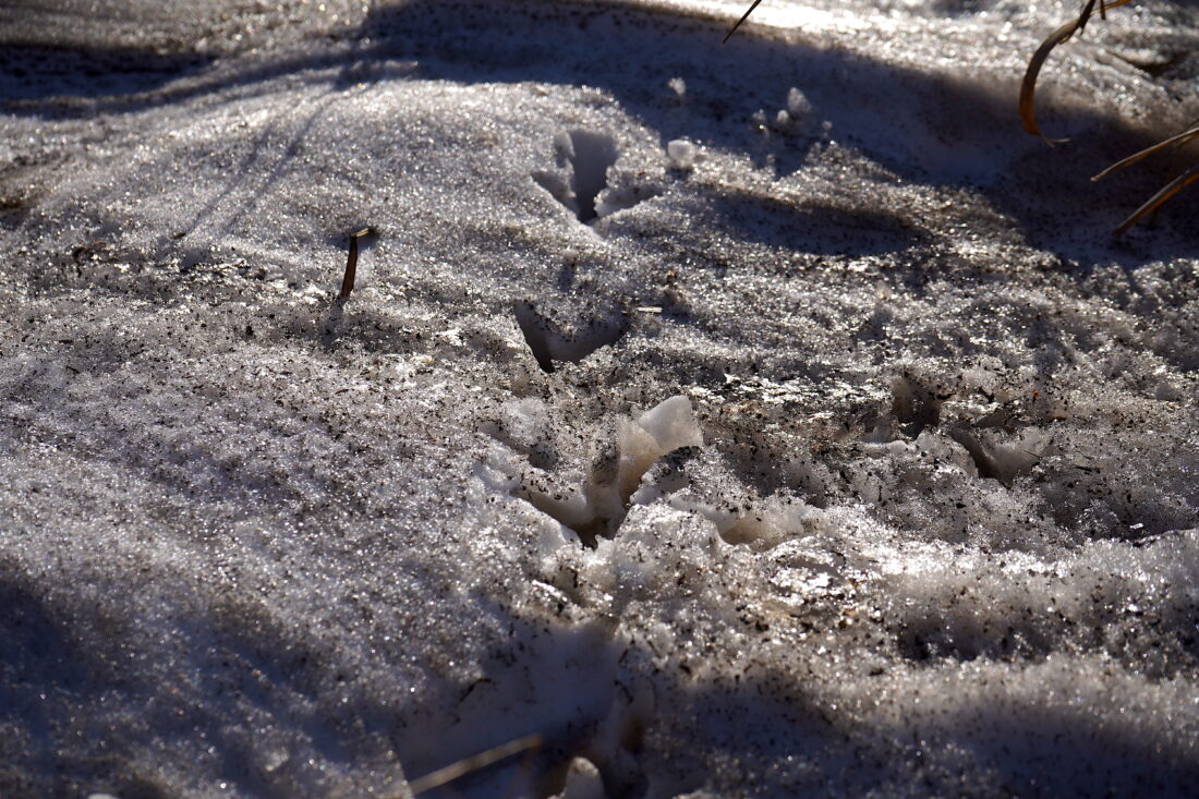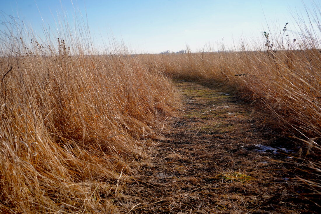 As Moose led the way down the north boundary parallel to 55th Street, temperatures registered 23 degrees Fahrenheit but, due to the bright sun and single-digit winds, felt like a warmer 27. The nearly two feet of snow that fell this winter between Thanksgiving and the end of December had long since melted, leaving Irvine Prairie’s trails generally firm with the exception of a few spongy spots here and there. Some snow remained in small caches throughout the prairie, kept safe by the sleeping grasses and forbs. Deep drifts were equally present along boundary edges, particularly on the north and west sides. But for the most part, the prairie was very dry to begin 2026.