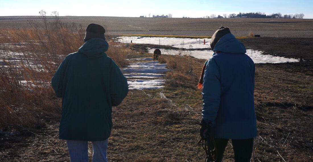 “In the 1800s and 1900s, (farmers) would walk around (their property) and check fences on New Year’s Day,” Cathy explained as she secured her winter garb and readied her chocolate lab, Moose, for the excursion just after 2 p.m. Thursday at the entrance to the original 77 acres she donated toward the creation of the University of Northern Iowa’s (UNI) Irvine Prairie. “It’s a perfect day for it today.”