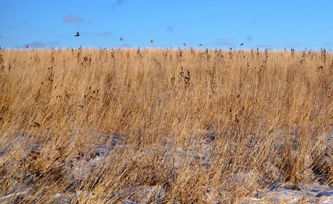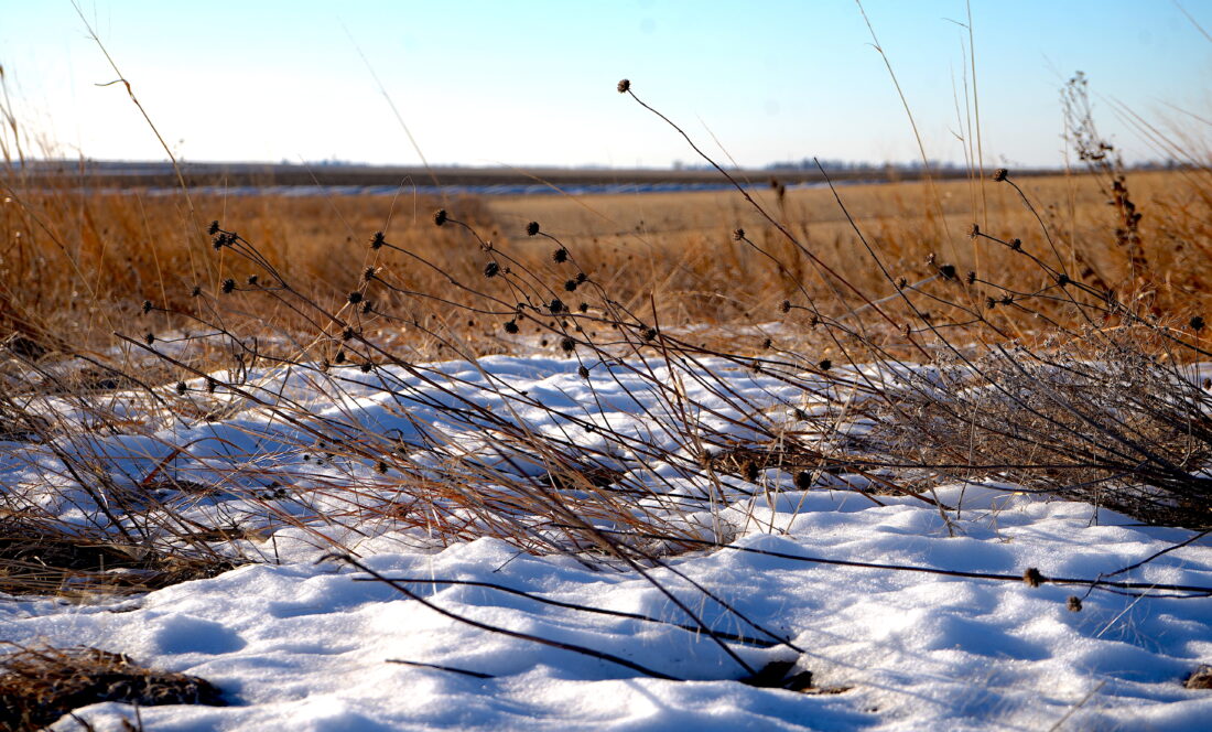 It was also very quiet with only Moose breaking the silence every now and then with his repeated flushing of the prairie’s resident ring-necked pheasant population. The quietude was similarly pierced from time to time with a sound reminiscent of falling sand as the breeze gently wove its way through the dormant grasses. Both the blue sky and butterscotch prairie made for an eye-catching winter scene — a postcard view punctuated only by the dark brown stalks of past compass plant blooms, standing tall like resolute sentries.
