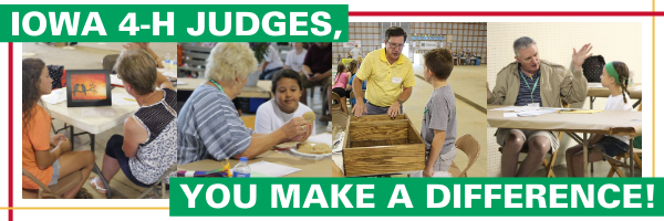 The general training series, titled “Evaluate, Educate, Encourage: 4H Judges’ Training,” provides a comprehensive introduction to Iowa 4H, positive youth development, and the expectations of judges who work directly with young people. Adults who wish to judge 4H exhibits at county fairs or the Iowa State Fair are encouraged to complete this training before working with youth. Seasoned judges are also invited to refresh their skills before summer judging begins.