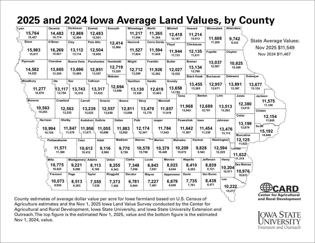 IOWA – Despite a slight overall increase across the state, average land values in Marshall, Tama and Grundy counties all dropped slightly in 2025 compared to 2024 according to information released by the Iowa State University (ISU) Center for Agricultural and Rural Development (CARD) last month.