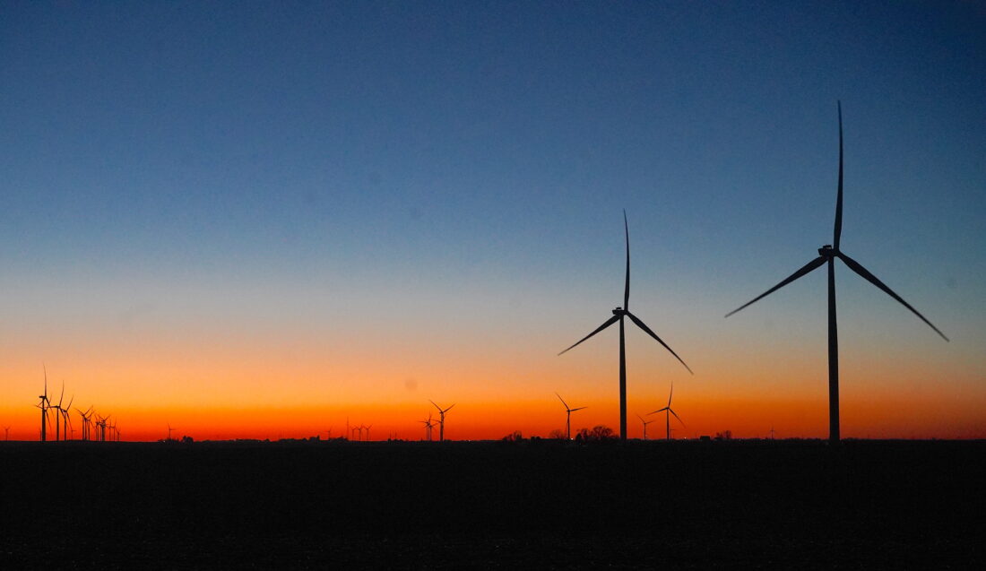 Vienna Wind Farm turbines south of Gladbrook pictured at dusk last April. SUN COURIER PHOTO BY RUBY F. MCALLISTER