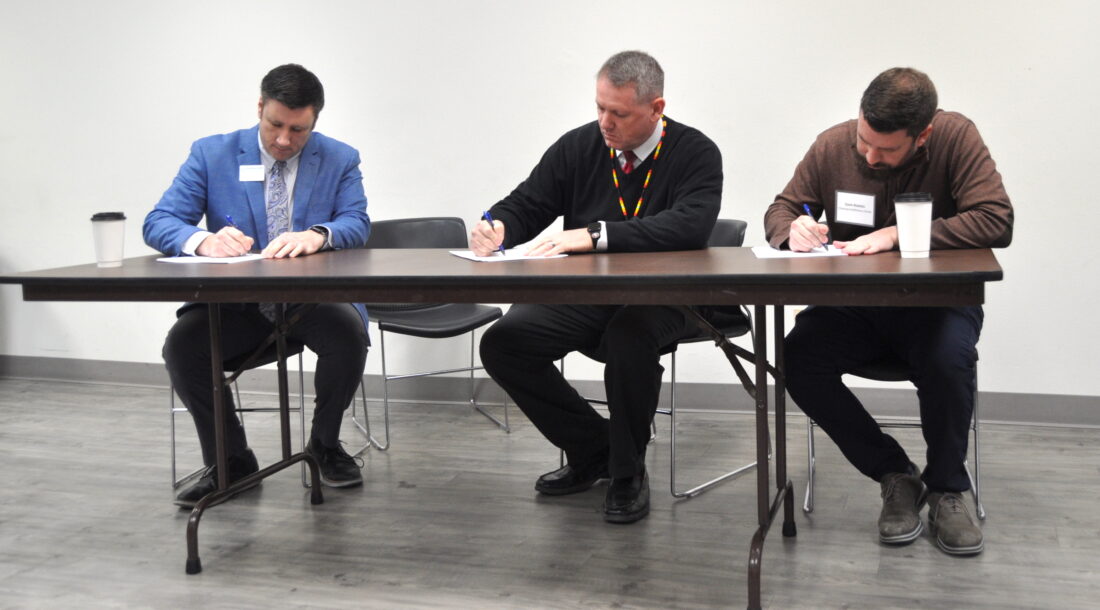 From left to right, Marshalltown Area Chamber of Commerce President/CEO John Hall, Tama County Board of Supervisors Chairman Mark Doland and Marshalltown Area Chamber of Commerce Board of Directors President Zach Stahlin sign copies of the new economic development contract between the two entities during a ceremony at the downtown State Bank of Toledo Community Meeting Room on Tuesday, Feb. 10, 2026. PHOTO BY ROBERT MAHARRY