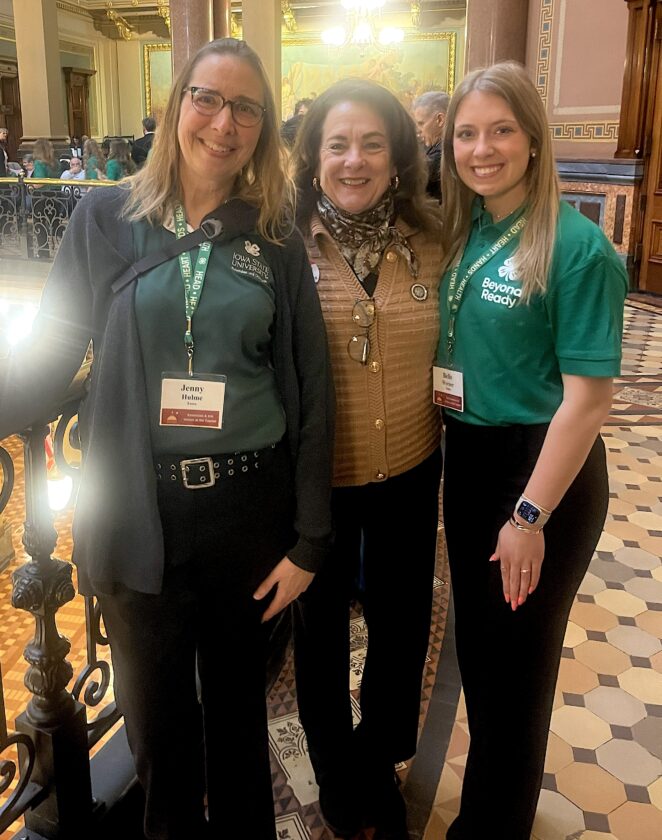 From left, Jenny Hulme, state Sen. Annette Sweeney (R-Iowa Falls), and Belle Werner pictured on Jan. 21, 2026, in Des Moines during Extension and 4-H Voices Day at the Capitol. CONTRIBUTED PHOTO
