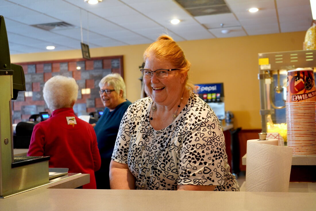 - Gladbrook Theater manager Audra Siddell smiles from behind the concession stand ahead of the “PIEOWA” screening on Saturday, Feb. 21. PHOTO BY RUBY F. MCALLISTER