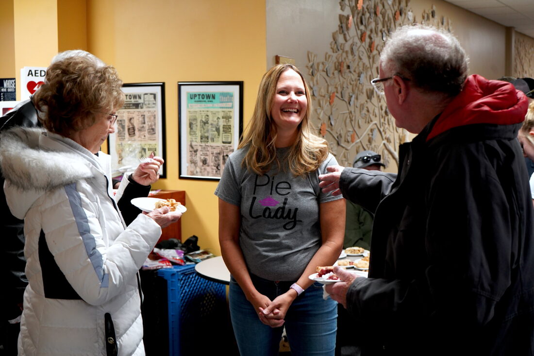 - The Pie Lady, center, chats with moviegoers following the “PIEOWA” screening as they enjoy slices of her delicious homemade pie which was featured in the documentary. PHOTO BY RUBY F. MCALLISTER