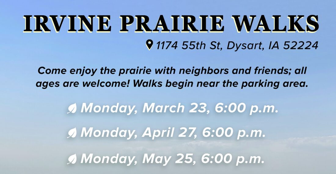 RURAL DYSART – Join the Tallgrass Prairie Center and local conservationist Cathy Irvine for evening strolls at Irvine Prairie (1174 55th St., Dysart) on the fourth Mondays of the month, beginning in March. Come enjoy the prairie with neighbors and friends; all ages are welcome!