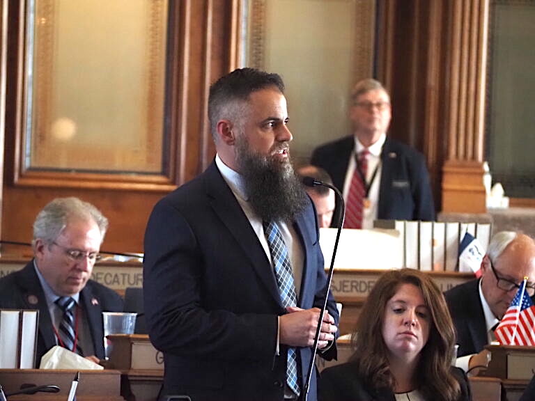 Rep. Brett Barker (R-Nevada) spoke in support of a bill sent to Gov. Kim Reynolds May 12, 2025 restricting certain business practices by pharmacy benefit managers in an effort to aid rural and independent pharmacies. PHOTO BY ROBIN OPSAHL/IOWA CAPITAL DISPATCH
