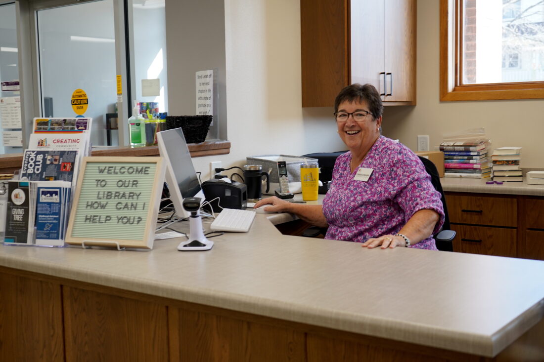 - Reinbeck Public Library children’s librarian/library assistant Cherie Eckhoff smiles from behind the relocated welcome desk this past Monday afternoon. PHOTO BY RUBY F. MCALLISTER
