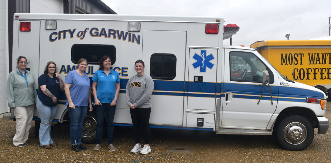 - Members of the Garwin EMS Department – from left to right, Chelsey Parks-Medhus, Ashley Kajer, Debbra Stamp, Sherry Parks and Laurel Upah – pose for a photo in front of their ambulance vehicle during an open house for the new station last Sunday. PHOTO BY ROBERT MAHARRY