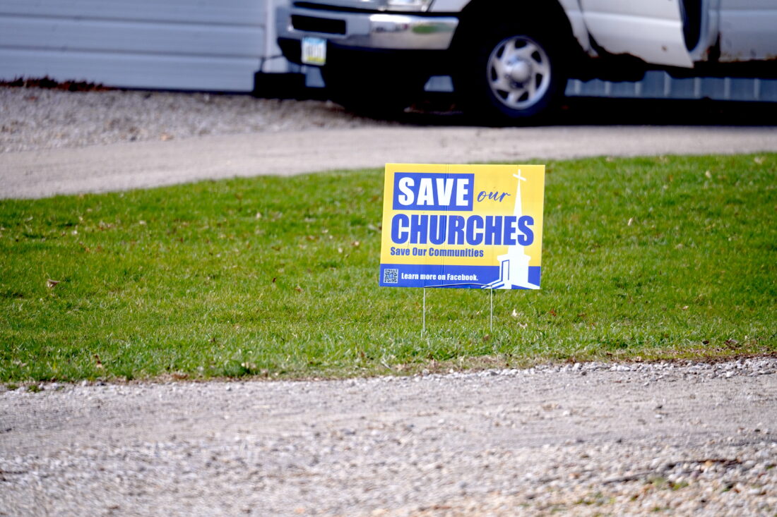 - A ‘Save Our Churches, Save Our Communities’ yard sign pictured last Friday in Traer. PHOTO BY RUBY F. MCALLISTER