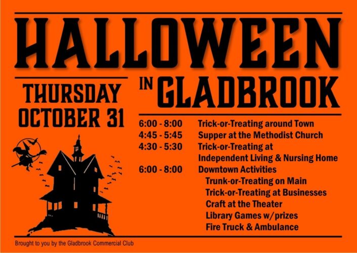 GLADBROOK – The Gladbrook Commercial Club has a whole bunch of fun planned for Halloween on Thursday, Oct. 31, from 6-8 p.m.