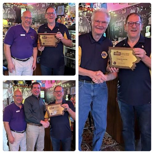 REINBECK – During the monthly bingo night held on April 18 at The Dig Inn, three members of the Reinbeck Lions Club were honored with the Iowa Lions Foundation’s prestigious Warren Coleman Honorary Award including Chris Frischmeyer, Craig Schildroth, and Dale Wambold.