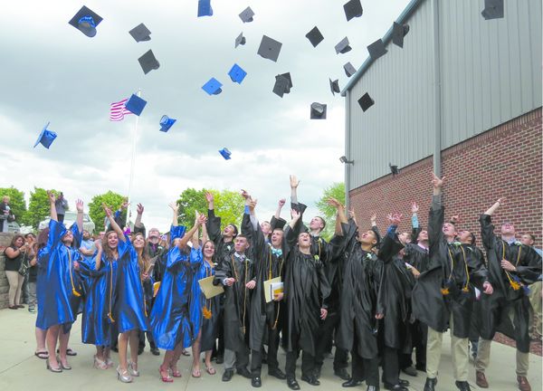 Photo by Margaret Thomsen Left-GMG Graduates of 2015 followed tradition as they tossed their hats in jubilation following the Commencement on May 17. The wind carried the hats to levels matching the Graduates excitement and expectations.