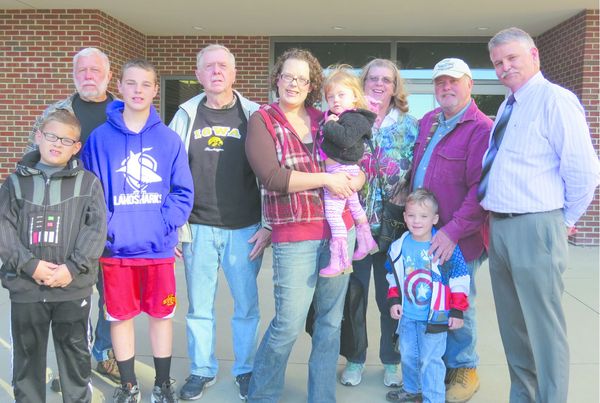 Photo by Margaret Thomsen The memory of 1965 Garwin High school graduate, Stephen Hass, was honored on Stephen’s 68th birthday on October 16. His extended family gathered at the GMG High School. They viewed the group photo of the Class of 1965 and made arrangements to have Stephen’s photo added. For unknown reasons he had not had a senior photo, but did have a professional one taken for his parents before he left for service. Stephen died in Viet Nam on June 21, 1967. Hass Family pictured included: Great Nephew Tage Bowers, Brother-in-law Ambrose Lang, Great Nephew Xander Bowers, Brother Alan Hass of near Gettysburg, PA; Niece Stephanie Bowers, holding Great Niece Phoebe Bowers; Sister Deb Long, Brother-in-law Ken Coppick (husband of Sister Sandra) from Winterset; GMG Principal Mark Polich and Brody Bowers in front. The Lang and Bower Families are from the Marshalltown area. Not present for the picture were Mom Alma Hass and sisters Mary Lamothe and Clara Peters.